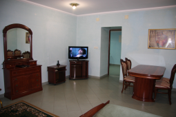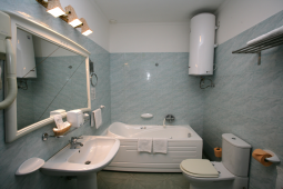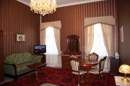 The noble comfortable room is 32sq.m. with a lounge and bedroom area. The amenities include one large double or two large double beds, a sofa, a coffee table, a tea/coffee maker, a dining table, a wardrobe, a big mirror, a 32in/81cm flat screen TV with satellite channels, a mini-bar, window blackout blinds, air conditioning, a telephone. The bathroom is equipped with Jacuzzi, a hair dryer, a magnifying mirror, toiletries, a white cotton towels and slippers. The Wireless broadband Internet access is FREE OF CHARGE.