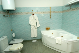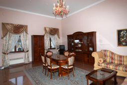 Поистине королевский трехкомнатный номер – гостиная 35 кв.м, спальная комната 25 кв.м, столовая с кухонным оборудованием для приготовления индивидуальных блюд 25 кв.м, - столовая и сауна. Номер расположен в старинной части гостиницы, имеющей высокие потолки и с окнами, выходящими на Кремлевскую улицу. Гостиная и спальная комнаты выполнены в венецианском стиле и украшены оригинальными светильниками и люстрами из стекла Мурано. Гостиная комната имеет ЖК телевизор с экраном 32 in/81cm со спутниковыми каналами, большой обеденный стол, мини-бар, диван, журнальный столик, посудный шкаф, телефон, кондиционер. Имеется гостевой туалет с душевой кабиной. В спальне - двуспальная кровать, платяной шкаф, комод, большое зеркало, полное затемнение окон (black-out), телевизор со спутниковыми TV каналами, телефон. Ванная комната оснащена большой гидромассажной ванной, душевой кабиной, феном, увеличивающим зеркалом, имеется набор косметики, белые махровые халат и тапочки.